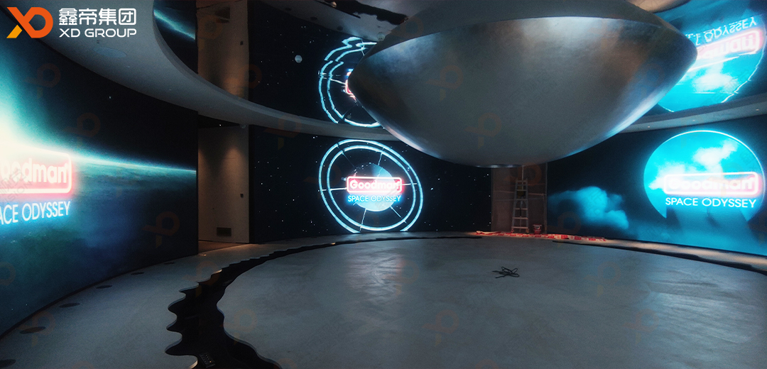 鑫帝集团高端定制P2沉浸式LED显示项目亮相Goodman中国运营中心,整个项目由四块8.64m*3.2m户内高清弧形LED屏围成一个大的圆环,让人360°无差别无死角的观看;再结合专业定制的视频源,让客户身临其境的感受Goodman的公司理念和发展历程,让人有更强的临场感和体验感。