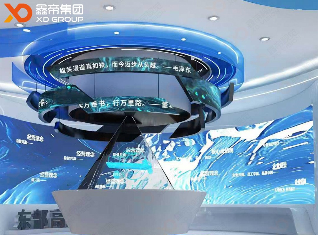 “客户的需求,就是鑫帝的使命。”面对江苏东部高速集团对展厅科技感与艺术性的双重期待,鑫帝集团不仅提供硬件解决方案,更深度参与空间动线设计与内容交互策划,打造“显示+交互+内容”的一体化生态。从前期3D建模到现场精准安装,从系统调试到后期运维支持,鑫帝以全流程服务确保项目零瑕疵交付,最终呈现的异形定制LED环幕不仅成为展厅的视觉核心,更成为行业异形显示技术的标杆案例。